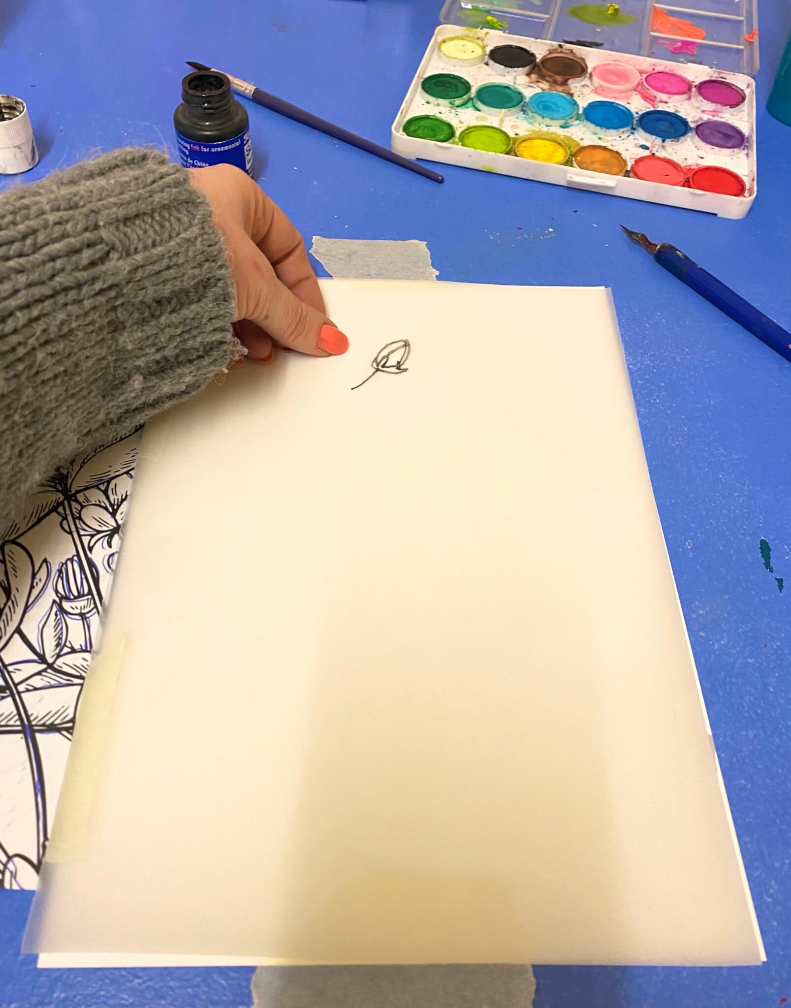 Das Aquarellpapier liegt daneben. Du wirst auf der Folie/ Transparentpapier zeichnen und diese immer wieder umlegen, um das gezeichnete auf dem Aquarellpapier aufzudrucken.